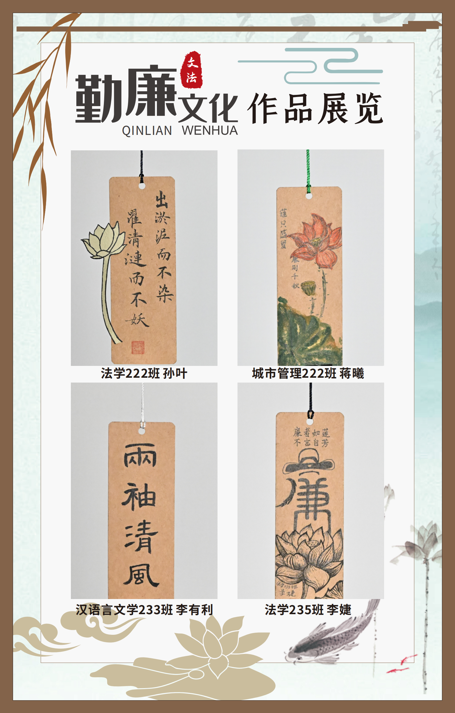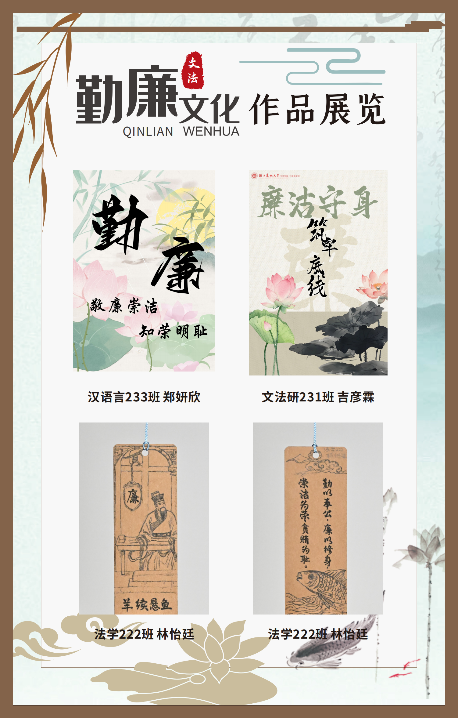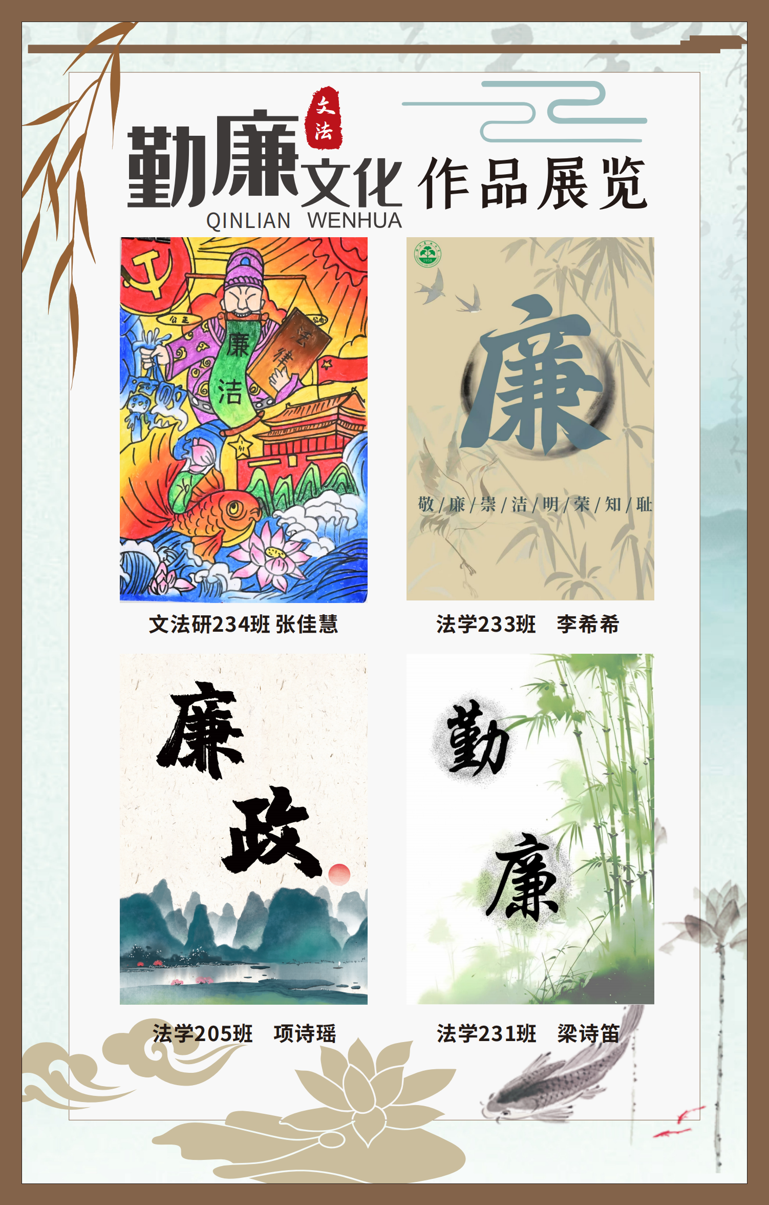 文法學(xué)院“步步生廉”文化走廊,植根于“六廉頌”清廉文化品牌,依托學(xué)院勤廉文化月活動,以師生清廉主題作品為媒介,系統(tǒng)呈現(xiàn)文法學(xué)院師生“知廉、守廉、促廉、倡廉”的實踐自覺,全景展現(xiàn)將新時代廉潔文化建設(shè)融入“立德樹人”根本任務(wù)的生動范例。