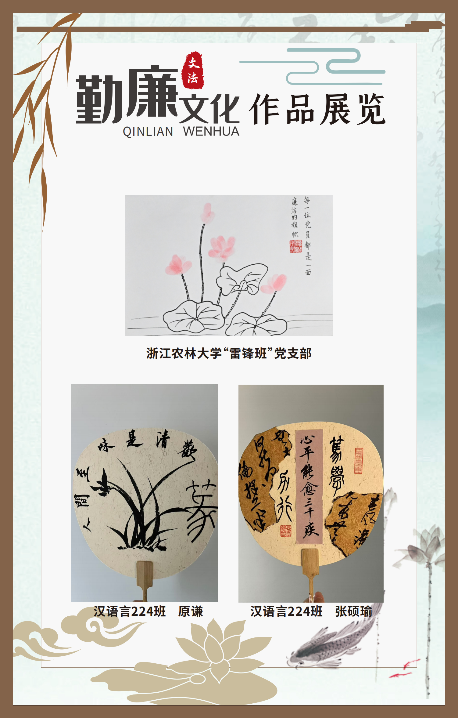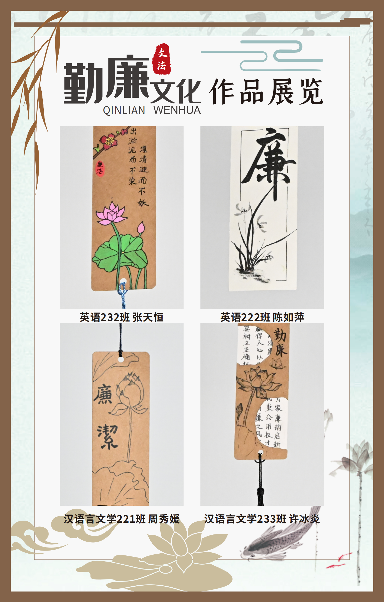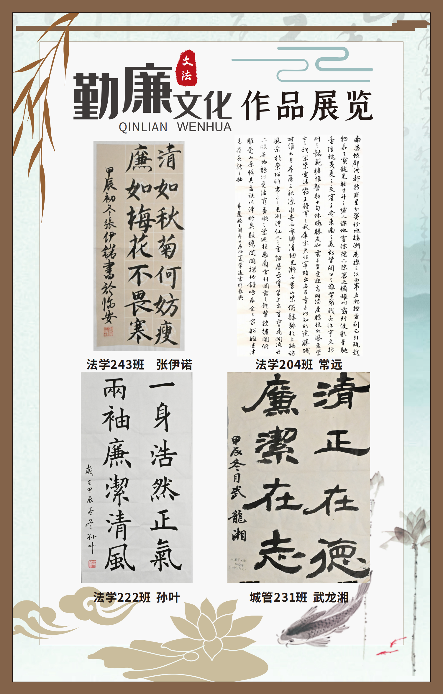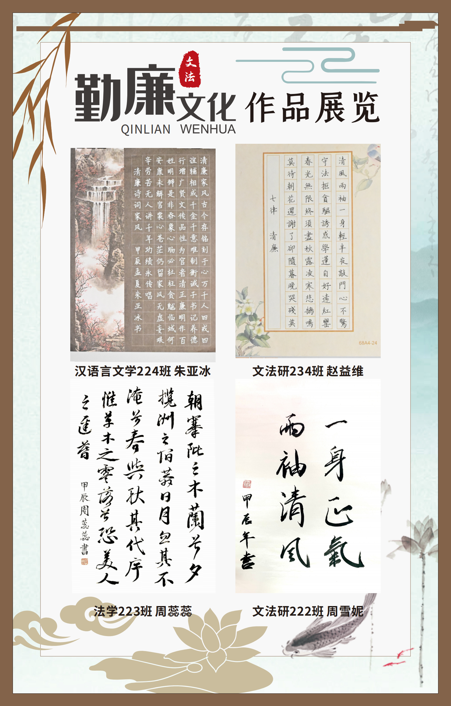 文法學(xué)院“步步生廉”文化走廊,植根于“六廉頌”清廉文化品牌,依托學(xué)院勤廉文化月活動,以師生清廉主題作品為媒介,系統(tǒng)呈現(xiàn)文法學(xué)院師生“知廉、守廉、促廉、倡廉”的實踐自覺,全景展現(xiàn)將新時代廉潔文化建設(shè)融入“立德樹人”根本任務(wù)的生動范例。