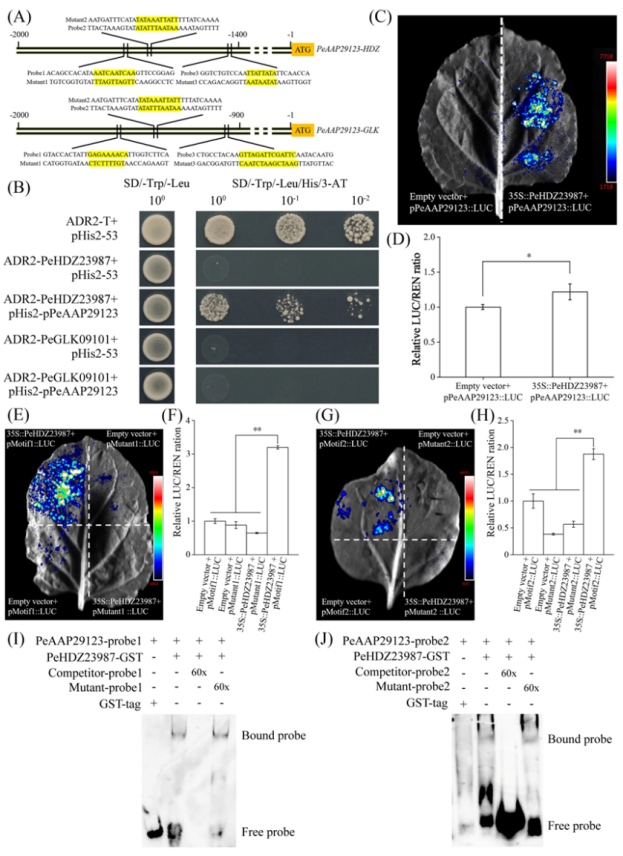 圖2PeHDZ23987與PeAAP29123的啟動子元件結合并激活其表達
