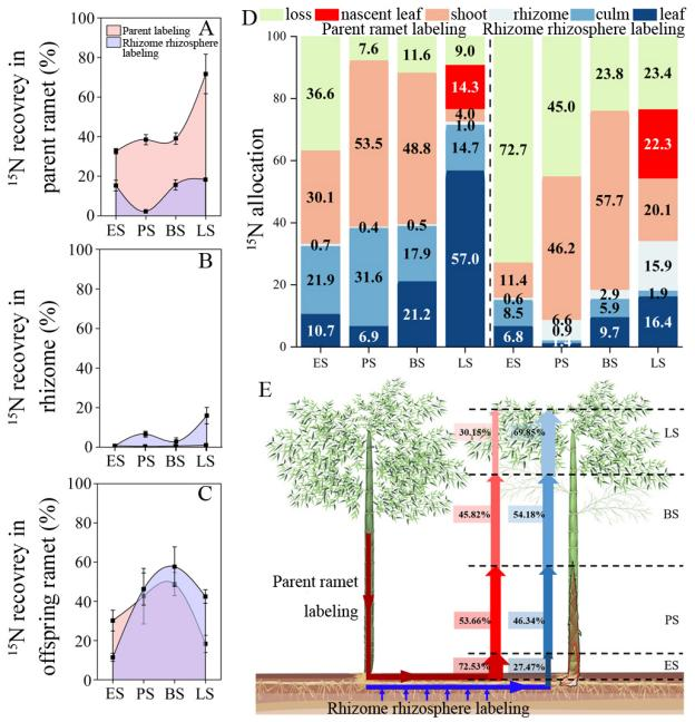 課題組創造性地在野外建立了“一竹一鞭一筍”模式系統,將毛竹從出筍到展葉這一快速生長階段分為四個時期(快速生長初期、盛期、抽枝期和展葉期),采用15N同位素示蹤和轉錄組測序技術,揭示了毛竹快速生長期氮素的動態供應機制。研究發現母竹和鞭根在毛竹快速生長期間分工合作為竹筍供應養分,形成從“母竹供應為主——母竹和鞭根協同供應——鞭根供應為主”的氮素供應策略(圖1)。