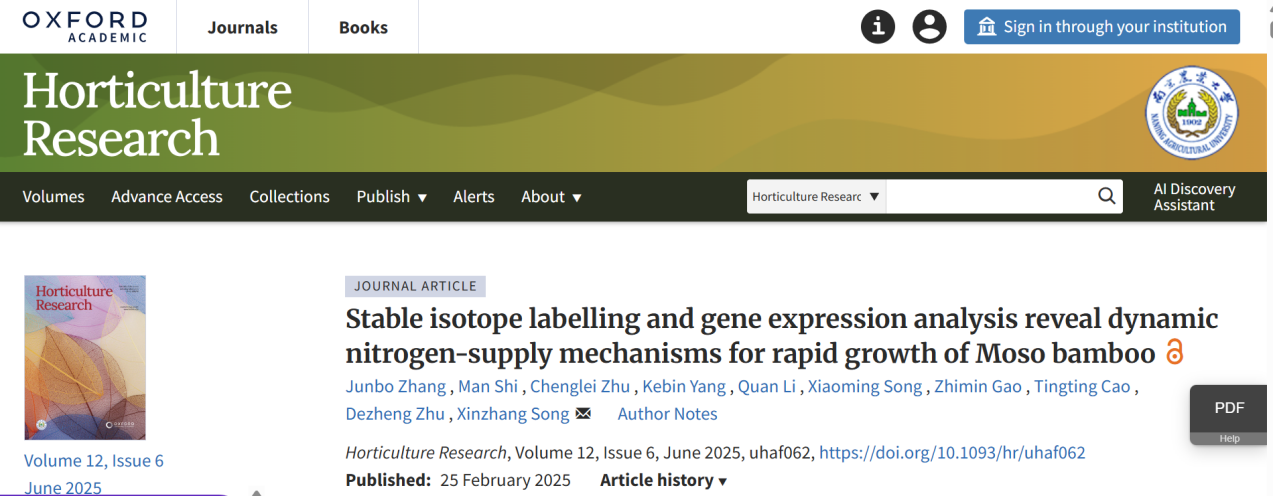 近日,竹子研究院竹林碳匯與生態多功能服務創新團隊在《Horticulture Research》(中科院農林科學1區Top,IF 7.6)發表題為“Stable isotope labelling and gene expression analysis reveal dynamic nitrogen-supply mechanisms for rapid growth of Moso bamboo”(《同位素示蹤和基因表達分析揭示毛竹快速生長的氮動態供應機制》)的研究論文。竹研院宋新章教授為本文通訊作者,創新團隊已畢業博士研究生張君波、施曼副教授,博士后朱成磊、青島農業大學青年教師楊克彬為論文共同第一作者。浙江農林大學竹子研究院為該論文第一單位和通訊作者單位。國際竹藤中心高志民研究員、華北理工大學宋小明教授等為該論文提供了重要指導。