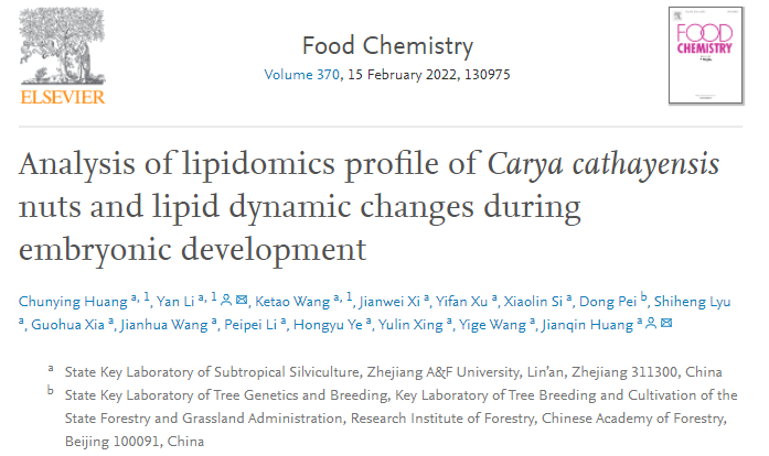 近日,國家重點實驗室干果研究團隊(黃堅欽教授課題組)在國際知名學術期刊Food Chemistry(IF=7.514)發表了題為“Analysis of lipidomics profile ofCarya cathayensisnuts and lipid dynamic changes during embryonic development”的研究論文。該研究首次解析了山核桃胚發育過程中油脂及脂質組分的動態變化,系統闡述了脂質類別和脂質分子數目,深入研究了脂肪酸組成,為山核桃健康功能因子的挖掘提供理論依據。