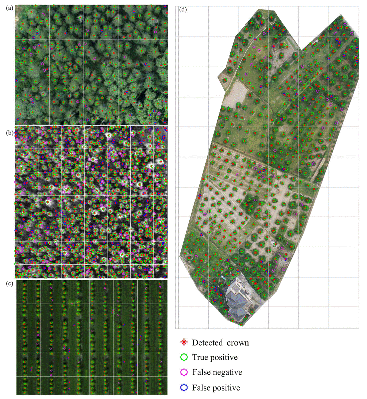 樹木位置和密度是評價林分空間結(jié)構(gòu)、碳儲量等森林結(jié)構(gòu)和功能的重要參數(shù)。通過樣地調(diào)查方法獲取林分密度是一項非常費時費力的工作。無人機等高分遙感技術(shù)是自動實時監(jiān)測林分密度的最佳方法,具有省時、省力和節(jié)約成本的優(yōu)點。本研究在傳統(tǒng)方法的基礎(chǔ)上,提出了一些合并和分裂的策略,在一定程度上解決了由于樹冠重疊、樹冠與背景難以區(qū)分、樹冠大小異質(zhì)性大等原因?qū)е聜鹘y(tǒng)的局部最大值法存在大樹冠“一分為二”和小樹冠“合二為一”等問題,取得了較高的監(jiān)測精度。